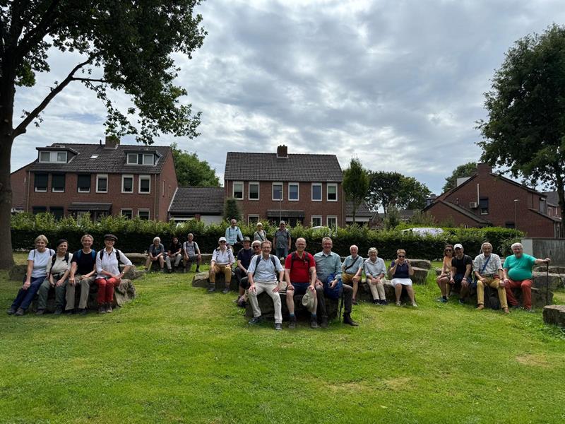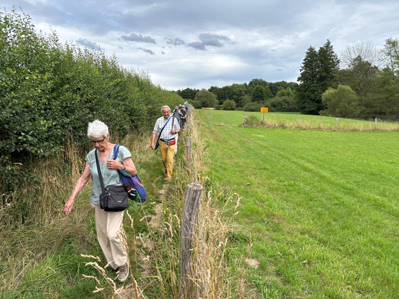 Door hen en nog een enkele bewoners van Limbourg uitgezwaaid, zijn wij op pad gegaan. Samen met de deelnemers van Lontzen, die zich bij ons hadden aangesloten. Het was een fraaie, vrijwel vlakke wandeling eerst richting Astenet. Onder de stralende zon liepen wij door weiden en over graspaden. Voorbij het Catharinastift, langs slot Thor en de visvijvers die Sieben Weihern waar volop op karper werd gevist. Ook lopend in de schaduw van bossen door holle wegen en regelmatig werd er gestopt om te genieten van de uitzichten. Aan het einde kwamen wij nog langs de kruisweg bij Walhorn. Daar aangekomen hebben wij na afloop een tijd in Haus Harna bijeen gezeten voor een consumptie en teruggekeken op een geslaagde wandeldag.