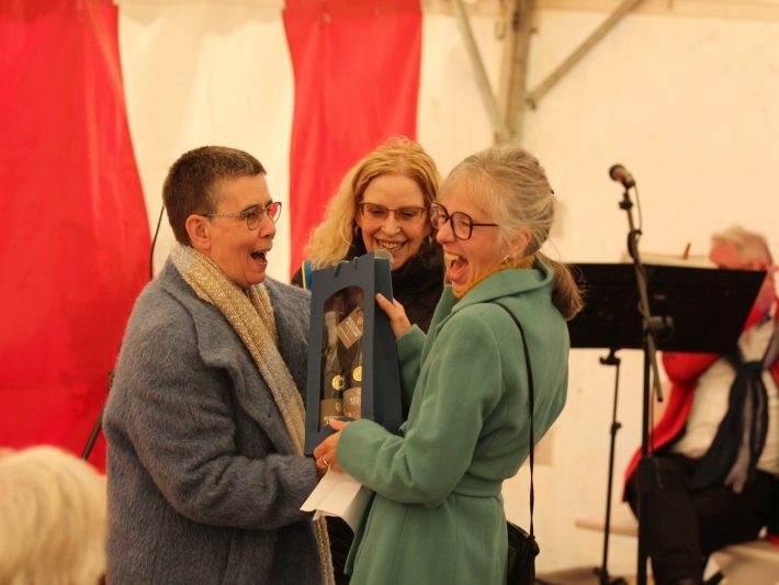 Na de mis gingen de gasten, onder leiding van onze voorzitter en ambassadrice Catharina Scholtens, op zoek naar de verborgen naamstenen op het St. Georges-plein. Voor de winnaars waren er weer mooie prijzen, die Catharina tijdens de pauze van het concert samen met Mariette uitreikte.