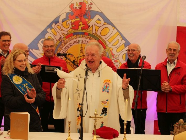 Om 11.05 uur kon de mis in de goed gevulde tent beginnen. Begeleid door het prachtige koor van de Moselsänger beleefden de aanwezigen een unieke, mooie en diepgaande viering! Vriendschap over landsgrenzen heen werd hier in devotie beleefd. De pastoor had zich bovendien ook nog als goochelaar gepresenteerd. Hij toverde uit de lege collectezak een levende witte duif tevoorschijn, als symbool voor de vrede, de aanwezigen waren verrast.